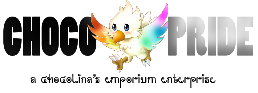 One of her great joys, CHOCO PRIDE is her brand of queer pride products and memorabilia. Working with Feo closely, Chocolina brings rainbows, sunshine, and infinate love to the peoples of the omniverse, and to Hydaelyn in particular.CHOCO PRIDE carries a wide array of products to it's lineup. From your standard flags, outfits, capes, cloaks, and so on to literal rainbows courtesy of Feo, and everything in between. This includes plushies of CHOCO PRIDE mascot Rainbocobo and the lovely queer romance novels by Maxe Sahashin.A portion of all CHOCO PRIDE sales supports the Anthroparion Program of Atelier Iris, which uses Allagan technology to help couples who can't naturally reproduce have children. CHOCO PRIDE helps pay for the costs of this service so queer couples can take advantage of it free.