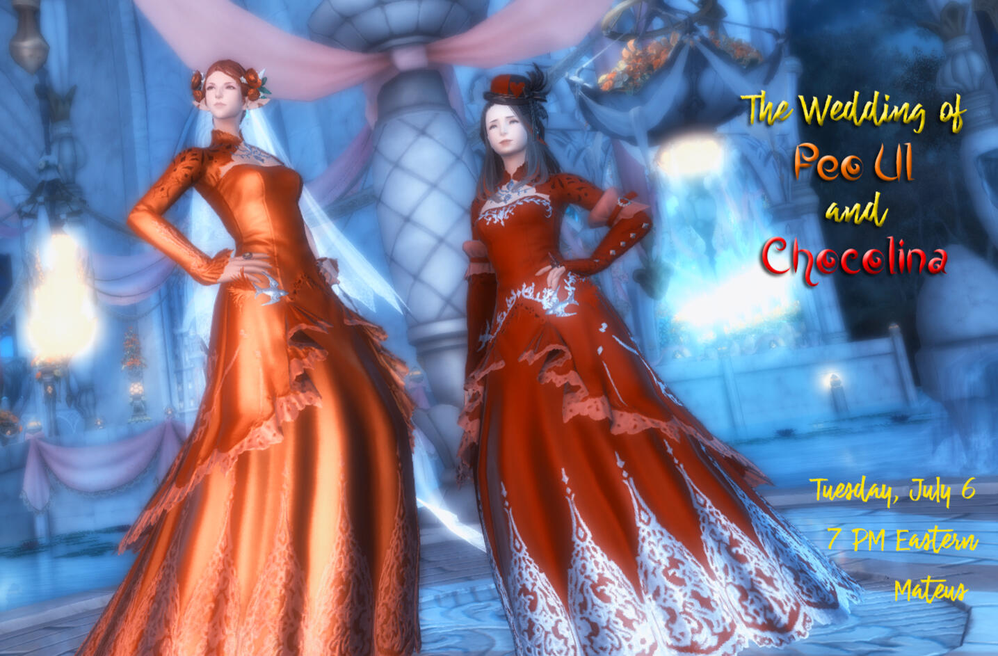 to be held to celebrate the very literal Eternal Bonding of immortal paradivine dimension-hoppers at the Sanctum of the Twelve in Eorzea, Hydaelyn on the Sixth Sun of the Fourth Astral Moon, at the Seventh Evening Bell.A reception will be held at Chocolina's Emporium afterword - address listed above.